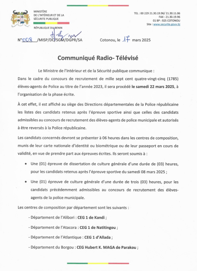 A travers un communiqué en date du lundi 17 mars 2035, le ministre de l’intérieur et de la sécurité publique informe que, dans le cadre du concours de recrutement de 1785 élèves-agents de Police pour l’année 2023, la phase écrite se déroulera le samedi 22 mars 2025. Les listes des candidats retenus après l’épreuve sportive et ceux admissibles au concours de recrutement des élèves-agents de police municipale seront affichées aux sièges des Directions départementales de la Police républicaine. Les candidats concernés sont invités à se présenter à 06 heures dans les centres de composition munis de leur pièce d’identité en cours de validité pour passer les épreuves écrites. Ces épreuves comprennent une dissertation de culture générale pour les candidats retenus après l’épreuve sportive et une épreuve de culture générale pour les candidats admissibles au concours de recrutement des élèves-agents de police municipale.