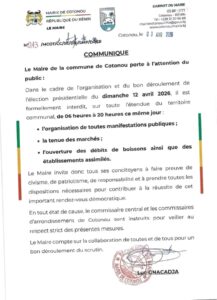 À l’approche de l’élection présidentielle du 12 avril 2026, la Mairie de Cotonou annonce des mesures strictes pour encadrer le déroulement du vote. Dans un communiqué officiel en date du 3 avril, le maire Luc GNACADJA informe les populations de restrictions temporaires sur toute l’étendue du territoire communal.