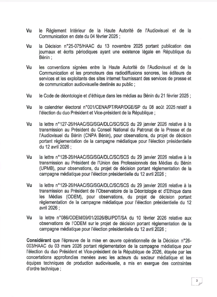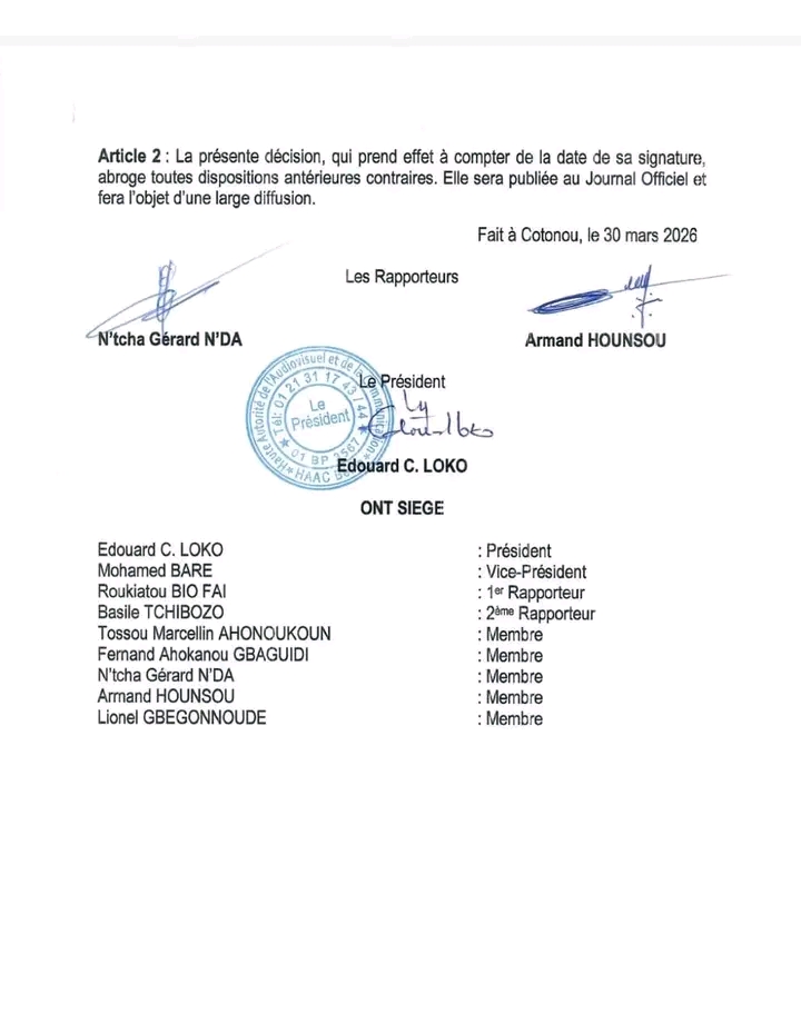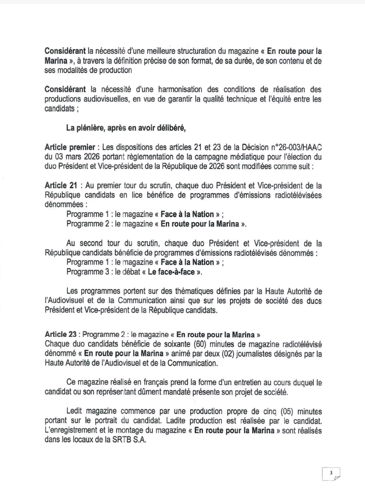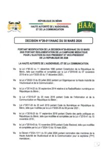 Par une nouvelle décision référencée N°26-011 en date du 30 mars 2026, l’institution présidée par Edouard C. Loko modifie les dispositions initialement fixées par la Décision N°26-003 du 03 mars 2026 relative à la réglementation de la campagne médiatique pour l’élection du duo Président et Vice-président de la République.