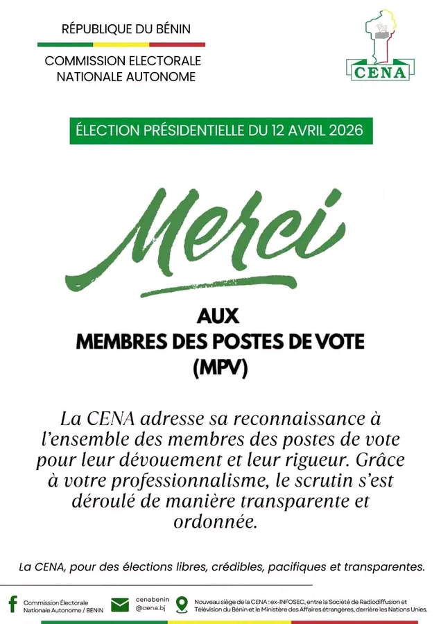 La Commission Électorale Nationale Autonome (CENA) a exprimé sa profonde reconnaissance à l’endroit des membres des postes de vote (MPV) pour leur engagement tout au long du scrutin.