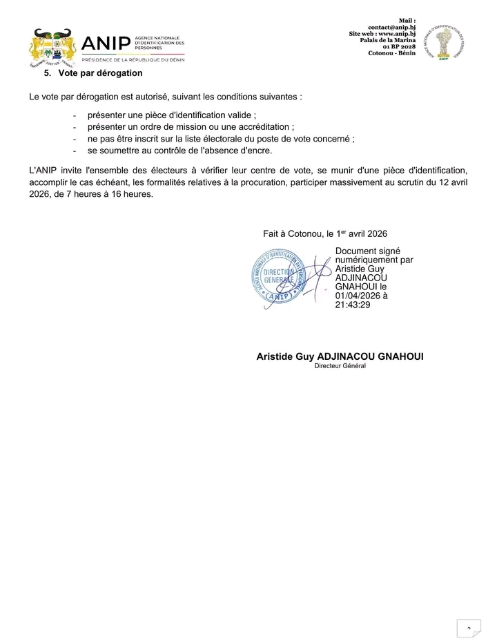 Enfin, l’ANIP exhorte l’ensemble des citoyens à accomplir les formalités nécessaires et à participer massivement au scrutin, prévu de 7h à 16h sur toute l’étendue du territoire national.