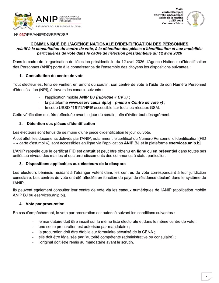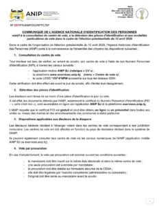 À quelques jours de l’élection présidentielle du 12 avril 2026, ANIP lance un appel important à l’endroit des électeurs. Dans un communiqué officiel, l’institution invite chaque citoyen à vérifier son centre de vote en amont du scrutin afin d’éviter toute difficulté le jour J.