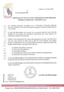 Le parti d’opposition Les Démocrates a officiellement adressé ses félicitations à Romuald Wadagni, déclaré vainqueur de l’élection présidentielle du 12 avril 2026, selon les résultats provisoires publiés par la Commission électorale nationale autonome (CENA).