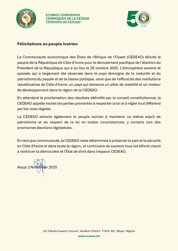 La Communauté Économique des États de l’Afrique de l’Ouest (CEDEAO) a adressé ses félicitations au peuple ivoirien à la suite de l’élection présidentielle organisée le 25 octobre 2025 en Côte d’Ivoire.