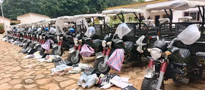 Au total, 63 kits d’une valeur de 316 millions de FCFA offerts par le Gouvernement, à travers le Plan National de Développement de la filière karité (PNDF karité). Ce geste a pour objectif de faciliter le déplacement aux bénéficiaires, les protéger contre les morsures des reptiles, puis les aider à bien sécher les noix pour une meilleure transformation des noix en beurre et en faire un « label Bénin ». Chaque kits octroyé est composé d’un tricycle à guidon de 300 CC avec une capacité de 800 kilogrammes, de 4 bâches de séchage, de 14 équipements de protection individuelle avec grans et cache-nez, de 15 torches, de 15 boîtes et de 14 séchoirs métalliques destinés à améliorer les techniques de séchage des noix et des amandes pour un beurre de qualité marchande.