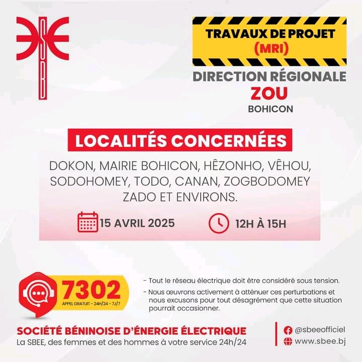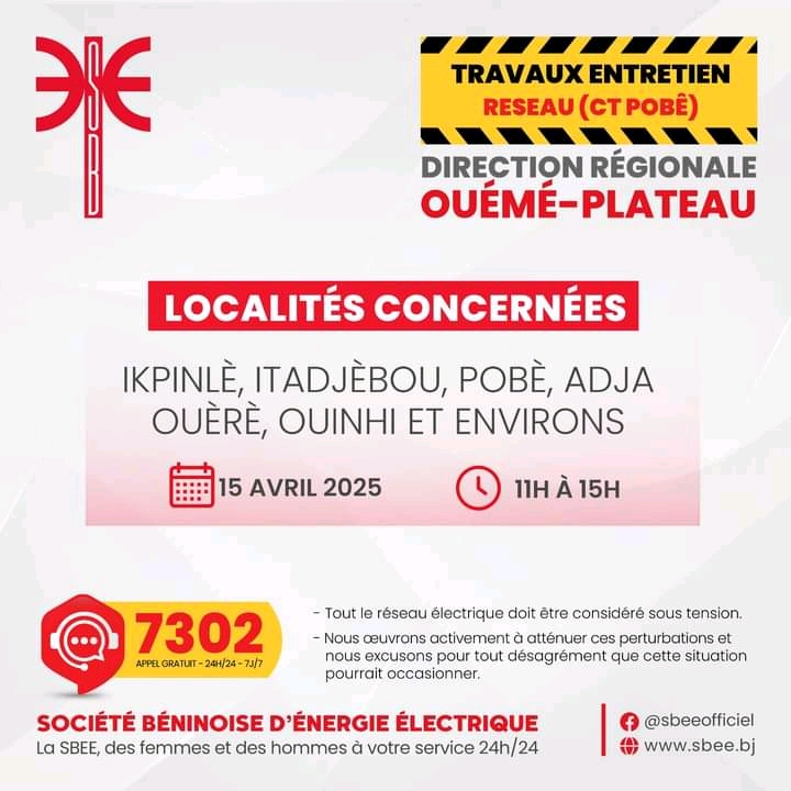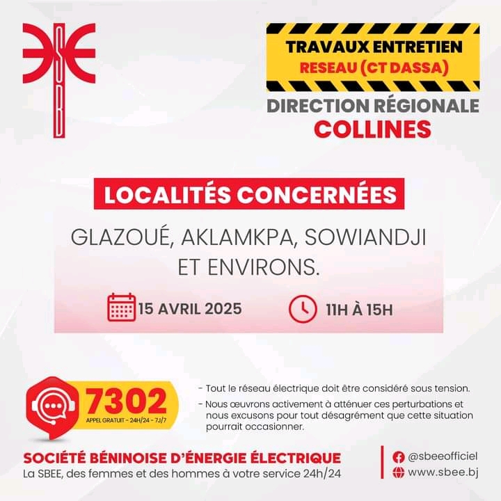 Dans le but d’améliorer la qualité de son service, la Société Béninoise d’Energie Électrique (SBEE) et ses partenaires effectueront des travaux de maintenance le mardi 15 Avril 2025, dans plusieurs départements du pays, pouvant entraîner des perturbations dans les localités.