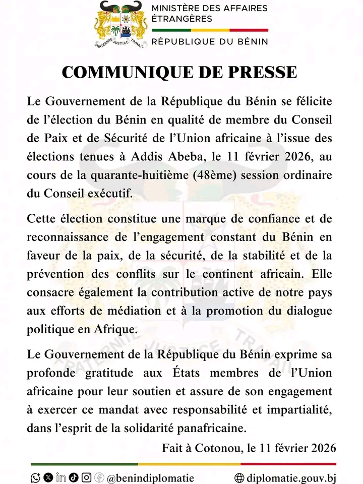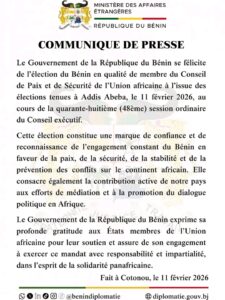 Dans un communiqué officiel rendu public le 11 février 2026, le gouvernement béninois a exprimé sa gratitude aux pays membres de l’UA pour leur soutien. Les autorités béninoises ont par ailleurs réaffirmé leur volonté d’assumer ce mandat avec responsabilité, impartialité et dans le respect des valeurs de solidarité panafricaine.